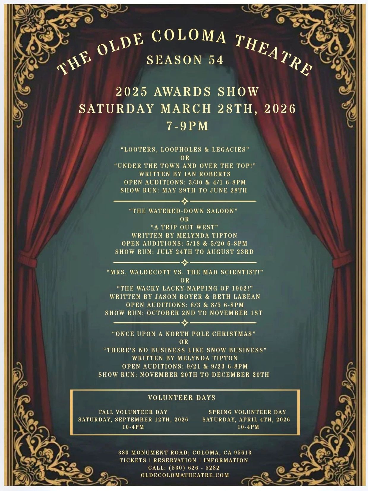 Four productions, beginning May 29th, 2026. Running thru to December 20th, 2026. With an open-audition date (and back-up) for all four of our Melodrama productions this year. As well as two, behind-the-scenes volunteer days. And of course, the 2025 Season53 Award Show, being held in March!